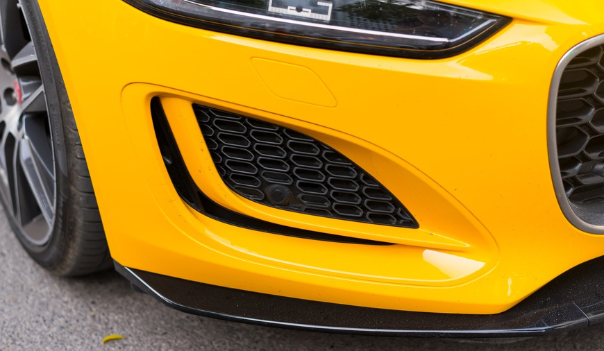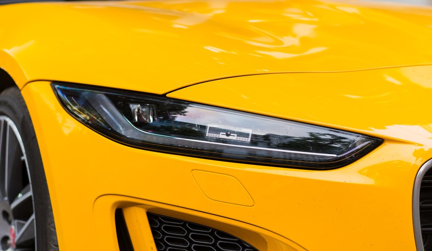 So với đời cũ, F-Type 2022 sở hữu thiết kế mới. Cụm đèn pha mảnh hơn, tích hợp công nghệ pixel LED. Lưới tản nhiệt phía trước cũng lớn hơn. Ngoại thất chiếc xe này sở hữu lớp sơn màu vàng Sorrento. Vì thuộc phiên bản R- Dynamic nên phần cản trước có thiết kế thể thao hơn so với phiên bản tiêu chuẩn.