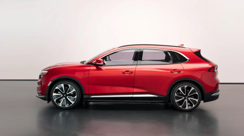 Chiếc SUV này có thiết kế phá cách so với mặt bằng chung của thị trường. Dải LED phía trước kéo dài như hình chữ V và cũng là logo của VinFast, đồng thời tạo thành hình tam giác bao trọn logo VinFast phía trước, gợi nhớ tới kiểu lưới tản nhiệt của xe Alfa Romeo đến từ Ý. Cụm đèn LED phía trước và sau cũng được tạo hình chữ V. Đèn chiếu sáng của xe đặt thấp. Bộ mâm xe 7 chấu đơn có kích thước lớn được khoác lên màu vàng nổi bật.