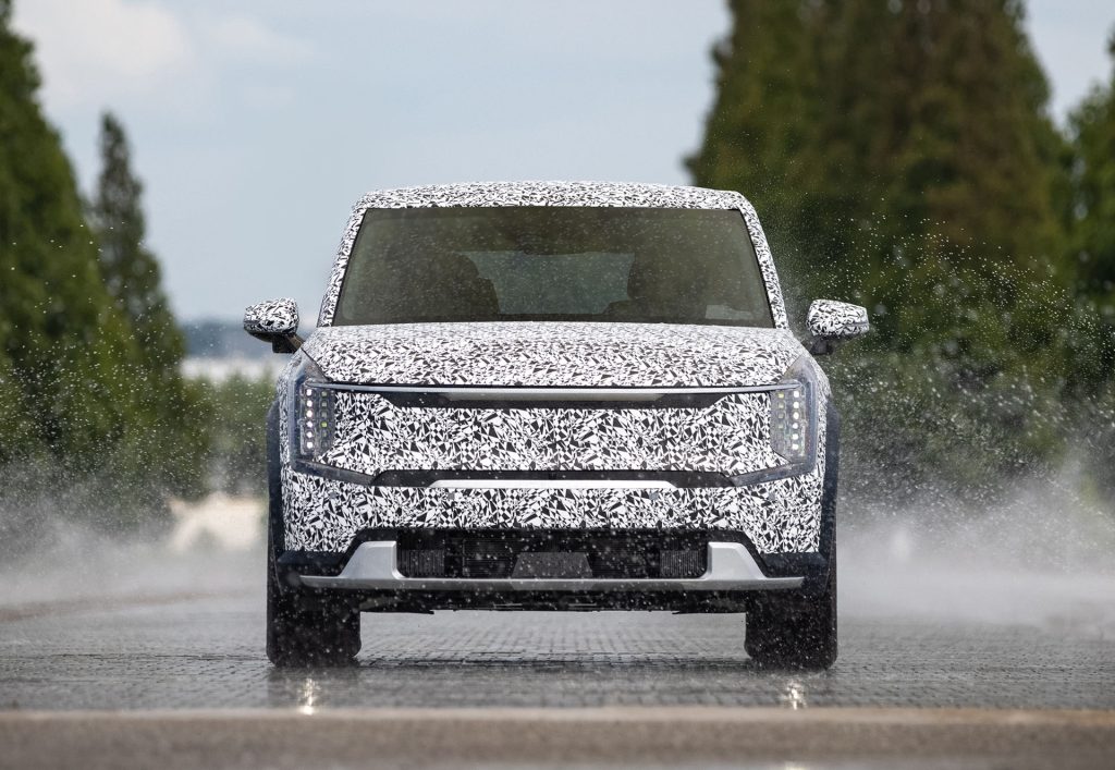 Những hình ảnh này cho thấy chiếc Kia EV9 đang được thử nghiệm tại trung tâm nghiên cứu và phát triển Namyang R&D toàn cầu của Kia ở Hàn Quốc. Tại đây xe đang được thực hiện các bài thử nghiệm leo dốc, khả năng xử lý ở tốc độ cao và tốc độ thấp trên bề mặt đường khô và có độ bám thấp… Điều thú vị là Kia không đề cập đến khả năng lội nước của mẫu EV9 này.